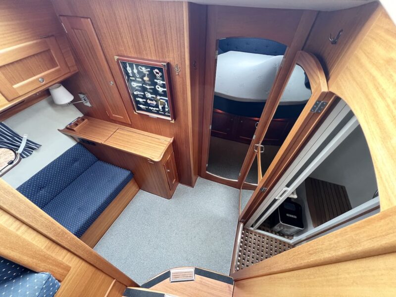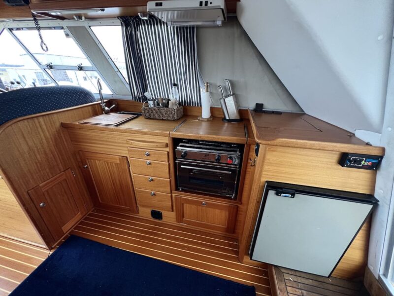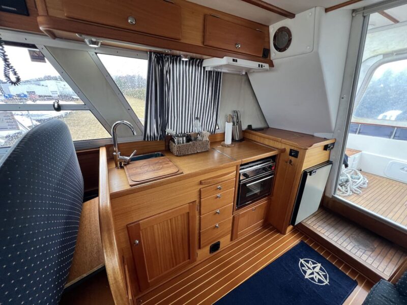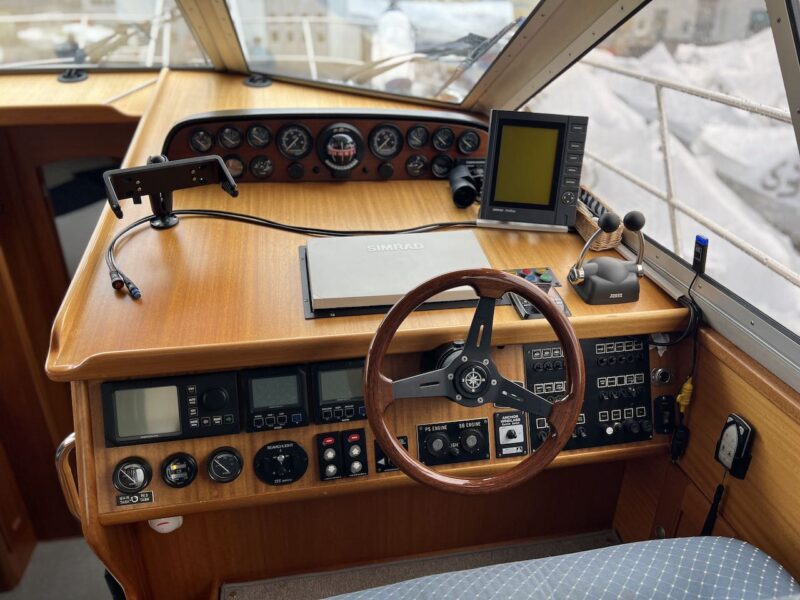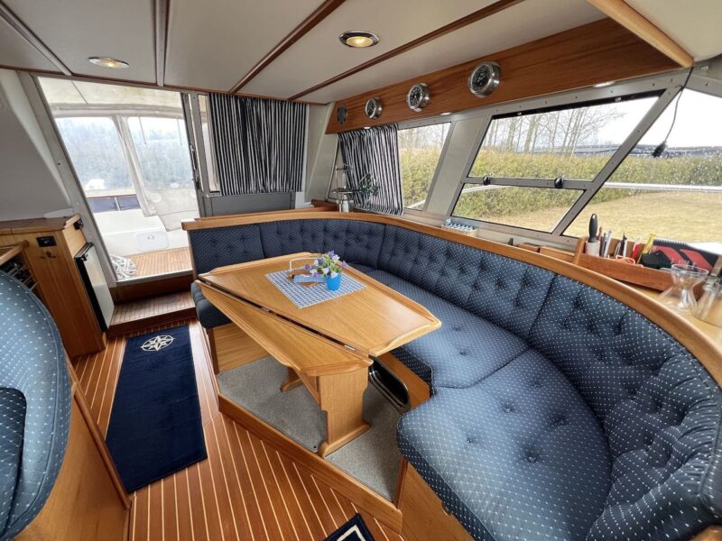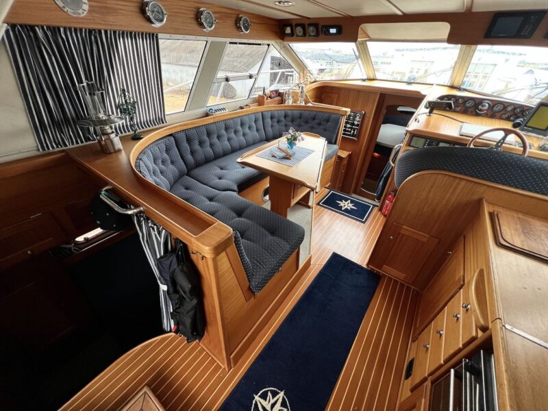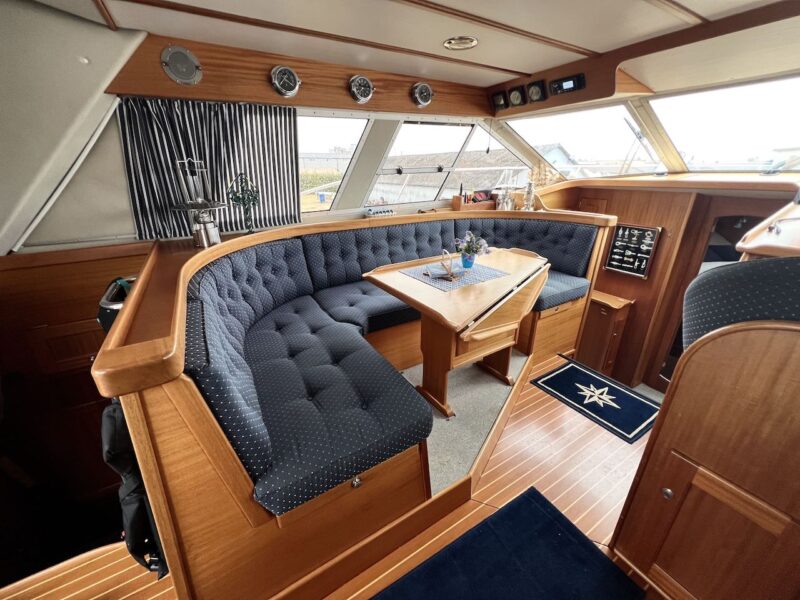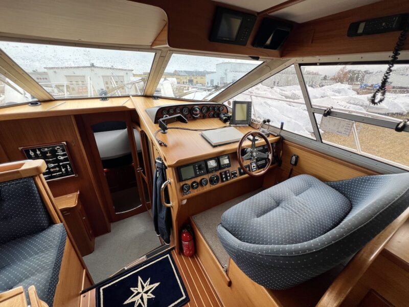 Mycket välplanerad flybridge från Nord West med ljus och rymlig salong med stor soffa. I denna layout finns totalt 3 hytter med dubbelsängar!