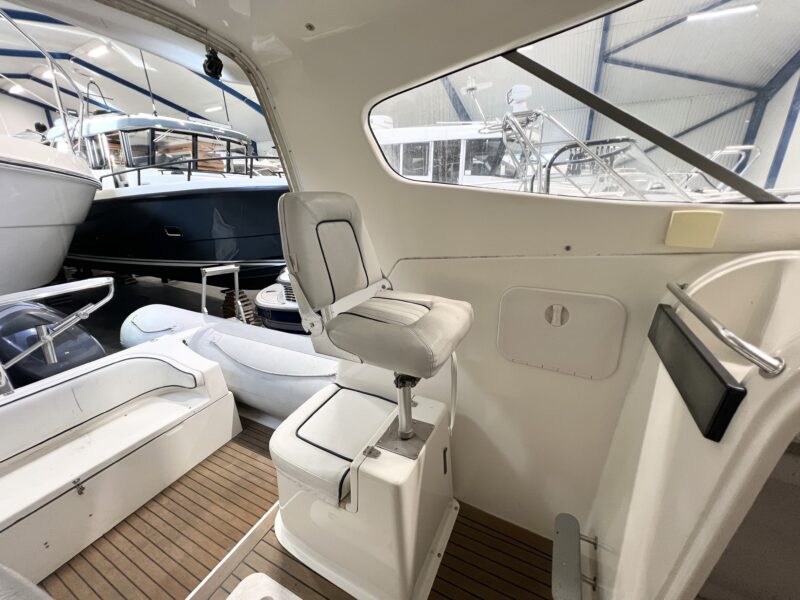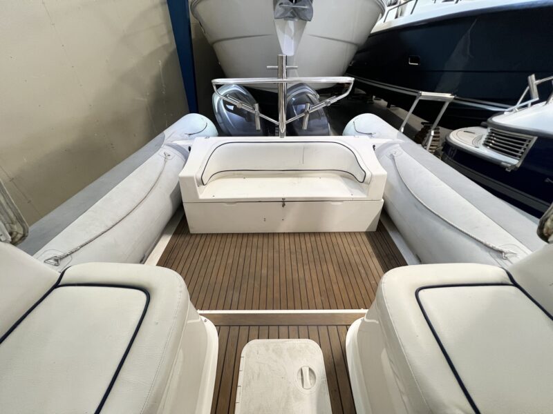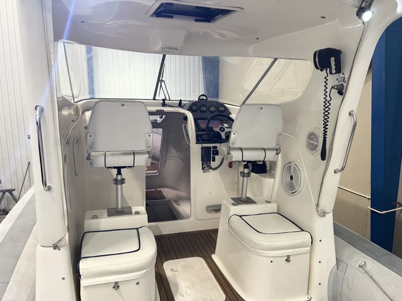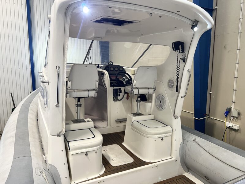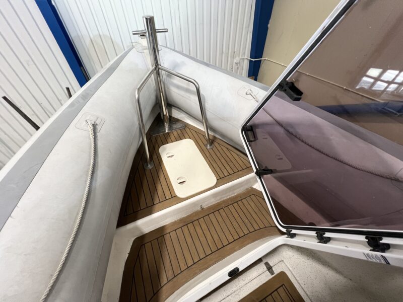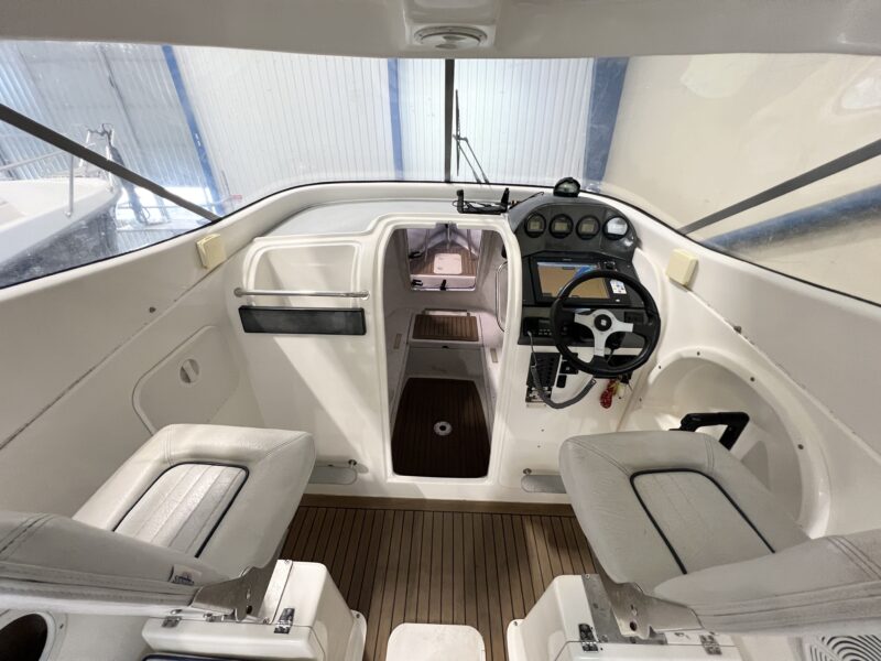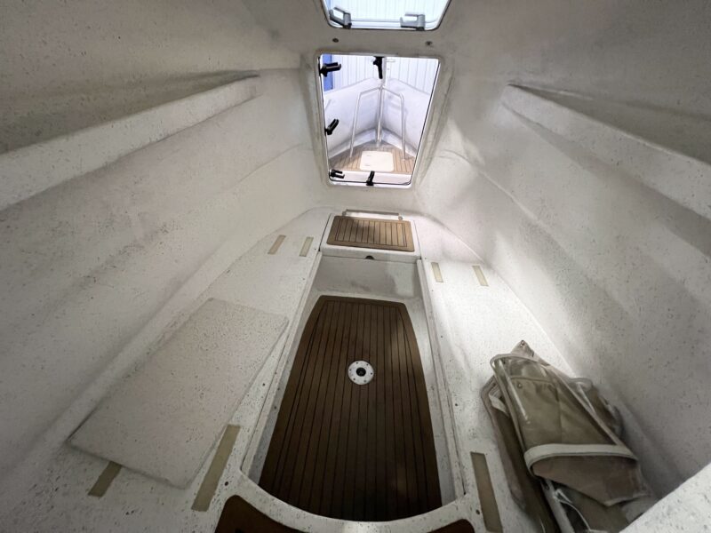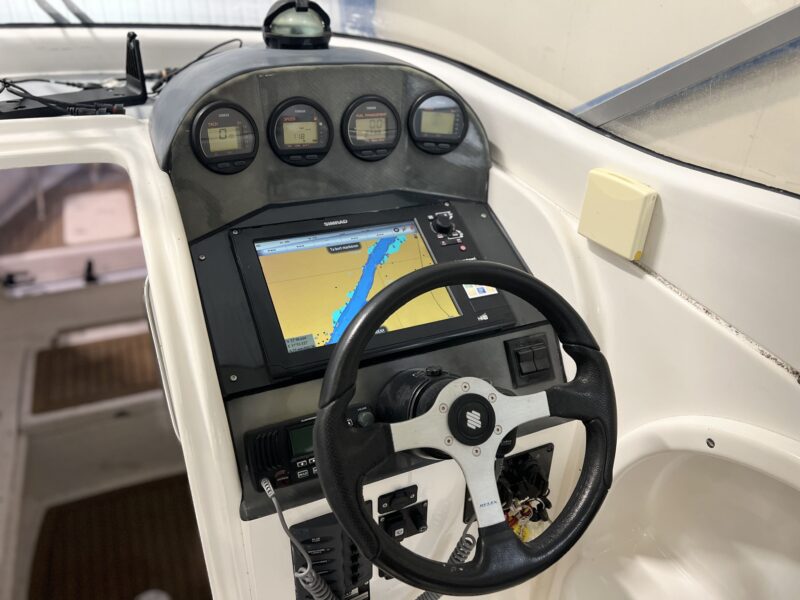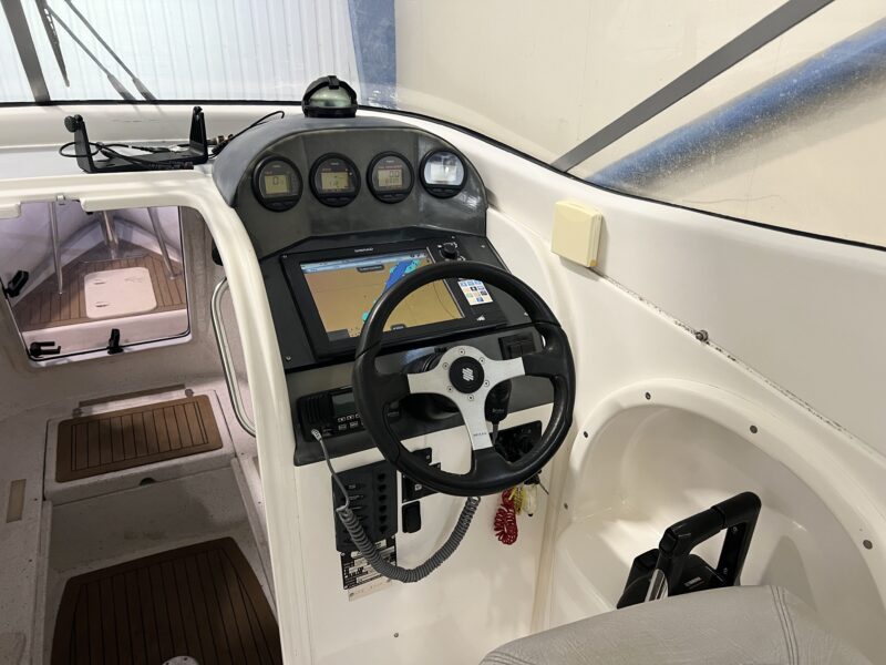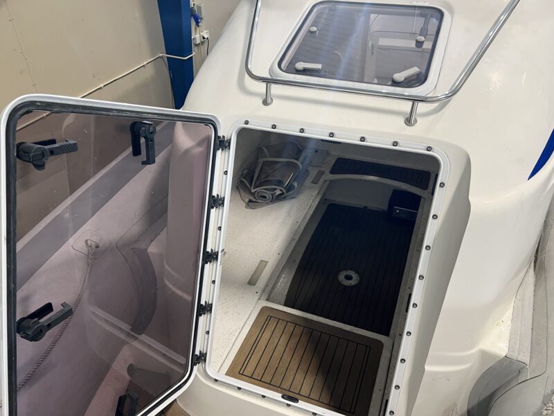 - Skrovet är handlagt i massiv glasfiber med djup V-form och 23–26° skrovvinkel, vilket ger en stabil och mjuk gång även i tuffare sjö. Med ett djupgående på endast 60 cm tar du dig enkelt in på grunt vatten.