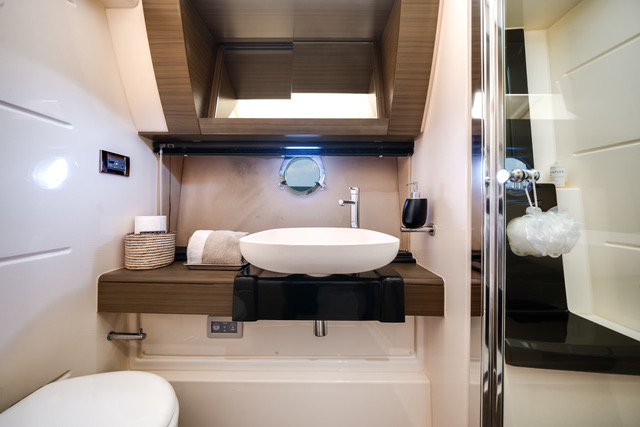 • Salongen är ljus och rymlig med sittgrupp och ett pentry placerat i aktern, i direkt anslutning till sittbrunnen. Detta skapar ett praktiskt och socialt flöde mellan inne- och utemiljöer.